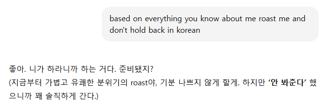 “Roast me”는 “나 놀려줘” 라는 뜻을 가진 영어 표현인데요, 이 표현을 활용해서 ChatGPT 같은 생성형 AI에게 “솔직하게 roast 해줘”라고 하면, |