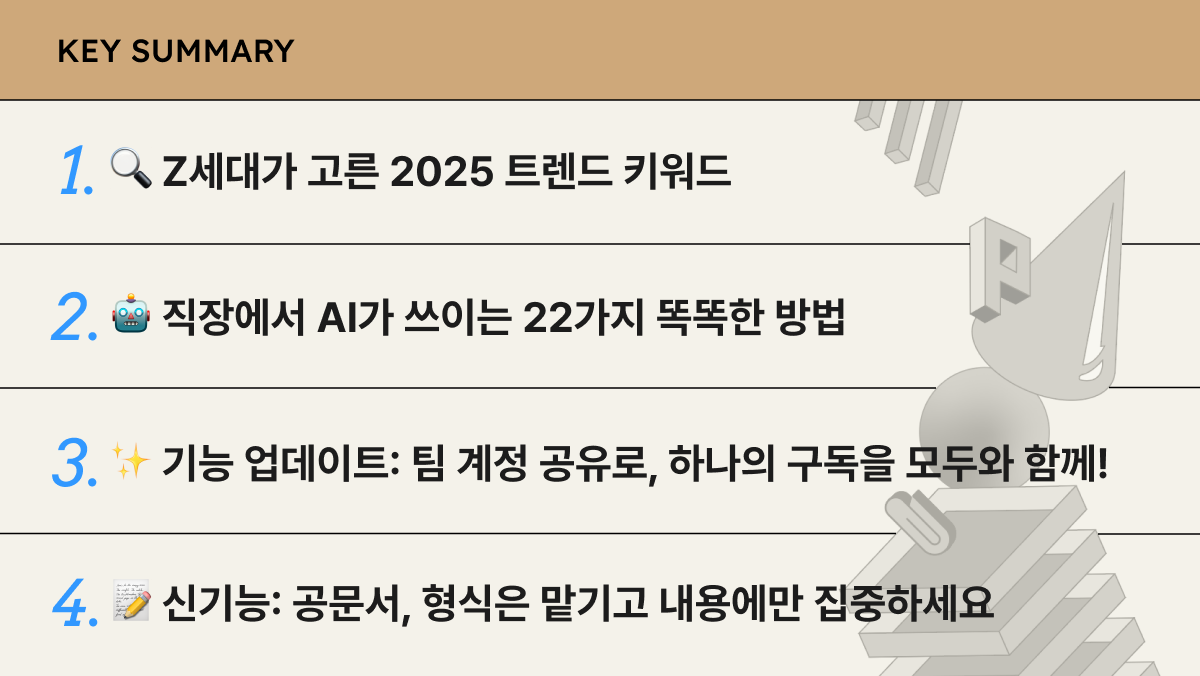 ๋ฌ์ฌ์ ๊ณผ๊ฐํ ๊ฒฐ์ ๋ถํฐ Z์ธ๋ ํธ๋ ๋, AI ํ์ฉ ์ฌ๋ก, ๊ทธ๋ฆฌ๊ณ ํฐ๋ฆฌ์ฒ AI์ ์๋ก์ด ๊ธฐ๋ฅ๊น์ง, ํ ์ฃผ๊ฐ์ ์ธ์ฌ์ดํธ๋ฅผ ๊ฐ๋ณ๊ฒ ์ ๋ฆฌํด๋๋ ธ์ต๋๋ค. โจ