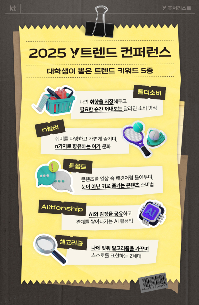 ํน์ ์์ฆ Z์ธ๋๊ฐ ๋ญ ์ข์ํ๋์ง ๊ฐ์ด ์ ์ ์ค์๋์? ๐ค ์ต๊ทผ KT๊ฐ ์ฃผ์ตํ โYํธ๋ ๋ ์ปจํผ๋ฐ์คโ์์ Z์ธ๋๊ฐ ์ง์ ์ฐธ์ฌํด ์ฌํด๋ฅผ ๋ํํ ๋ค์ฏ ๊ฐ์ง ํค์๋๋ฅผ ๋ฝ์์ด์. ๋ฐ๋ก ํด๋์๋น, N๋๋ฌ, ๋ฃํดํธ, Ai:tionship, ์