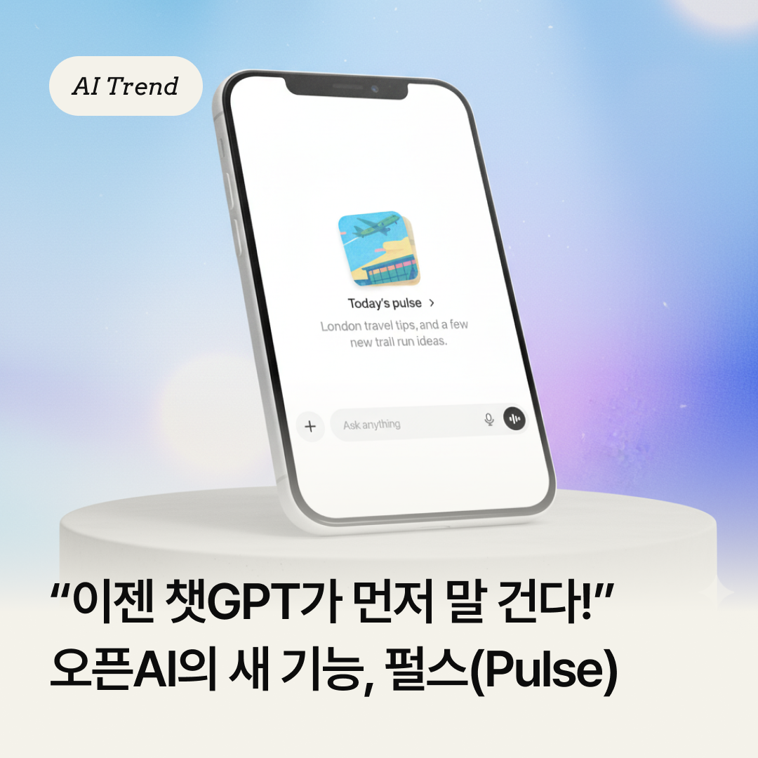 생성형 AI의 다음 단계는 ‘대답하는 AI’가 아니라, ‘먼저 말 거는 AI’! 최근 오픈AI가 공개한 챗GPT의 신규 기능 ‘펄스(Pulse)’는 사용자가 묻지 않아도, 필요한 정보를 스스로 제안하는 ‘능동형 AI 비서’의 시작을 알렸어요. 🌟 |